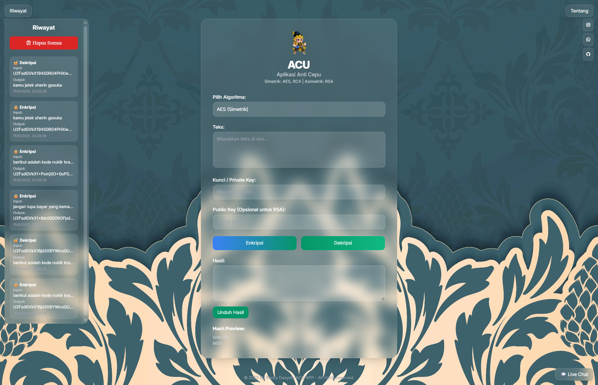 ACU (Application Crypto Universe) is an interactive web-based security application designed to help users easily encrypt and decrypt messages. It leverages popular cryptographic algorithms such as AES, RSA, and RC4 to provide robust text data protection.