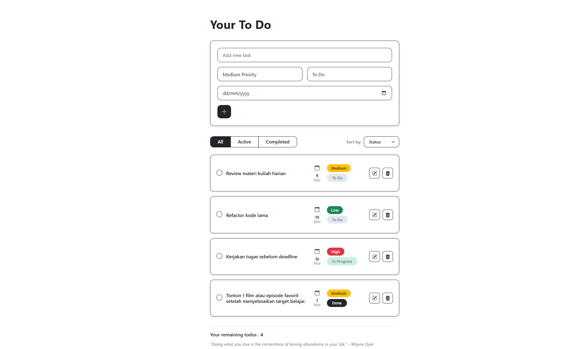YourTodo is a modern and responsive To-Do List web application built with React JS and Bootstrap 5.3. This project features smooth animations, clean design, and practical task management — including priorities, due dates, filtering, and sorting.